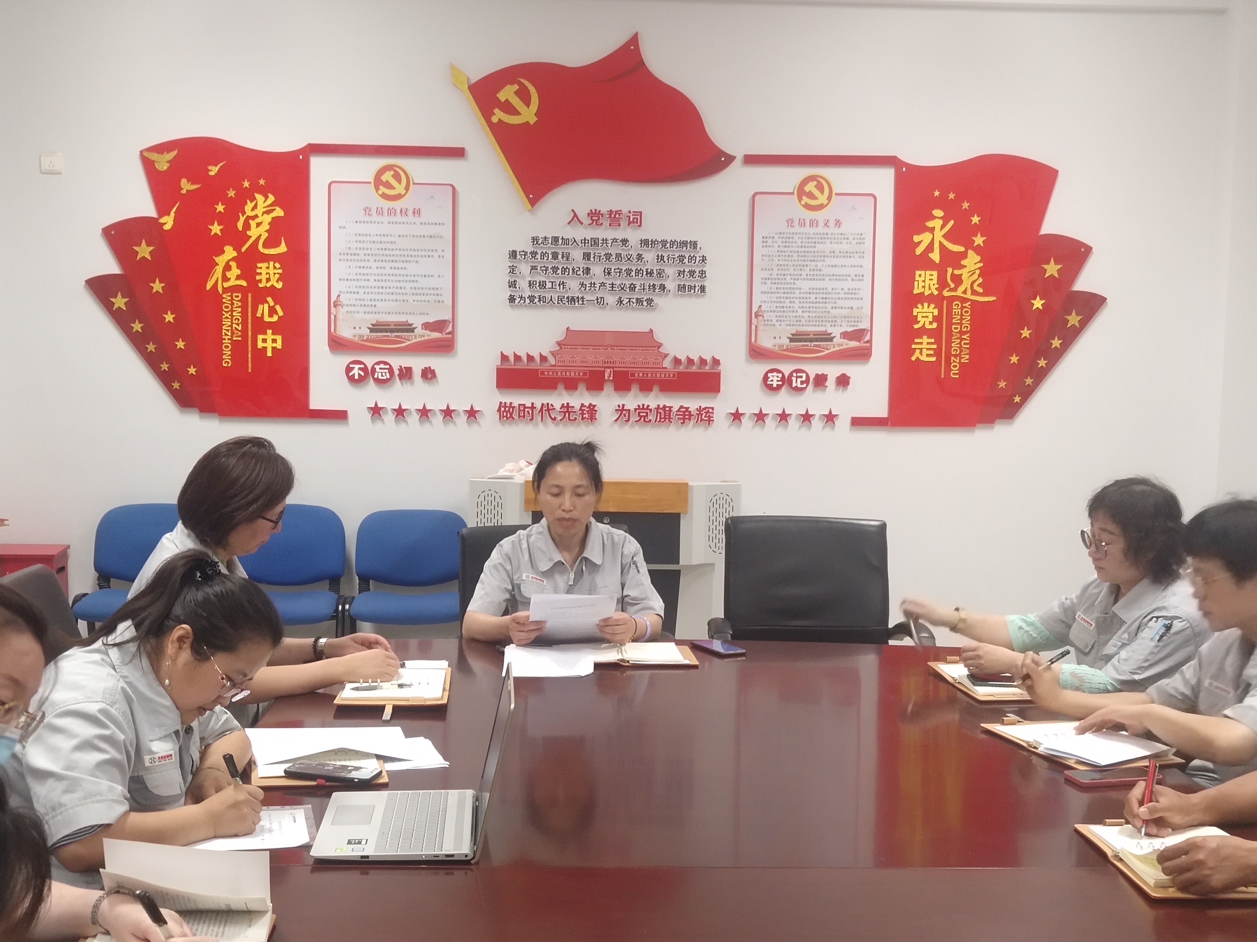 在全体起立重温入党誓词以后,会议正式开始。党支部书记廖艳萍同志代表支委会做了党支部上半年工作总结,深入查摆存在的突出问题,深刻剖析问题产生的思想根源,提出具体整改措施,并带头作个人对照检查。随后与会党员对照此次党史学习教育专题组织生活会检视内容,运用批评与自我批评的思想武器,勇于解剖自己、揭短亮丑,见人见事见思想,深入剖析自身教育学习中的差距和不足,大家从讲政治、讲规矩、讲道德、讲奉献的高度认真查摆自身存在的突出问题,交流了在工作中存在的困惑。通过深刻剖析问题产生的根源,既从工作中找差距,又上升到从思想上、党性上找差距,认真开展批评和自我批评。